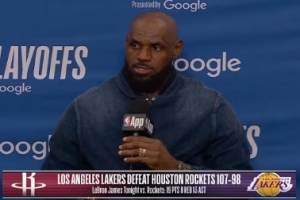 體育資訊4月19日訊 NBA季后賽首輪G1,湖人107-98力克火箭。賽后,詹姆斯接受了采訪,以下為采訪全文。
