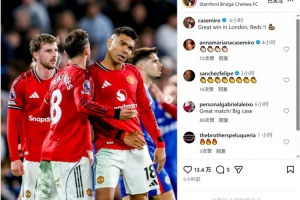 曼聯中場卡塞米羅社媒曬出與隊友一起慶祝的照片,配文:“在倫敦收獲一場重要勝利,紅魔!”