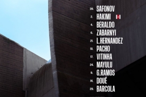 39-薩福諾夫、2-阿什拉夫、4-貝拉爾多、6-扎巴爾尼、21-盧卡斯、51-帕喬、17-維蒂尼亞、24-馬尤盧、9-貢薩洛·拉莫斯、14-杜埃、29-巴爾科拉