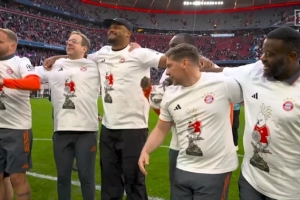 今天凌晨,拜仁4-2擊敗斯圖加特,將隊史第35座聯賽冠軍完美收入囊中。賽后,安聯球場內洋溢著狂歡的氣氛,而主角是一件極其特別的紀念衫。