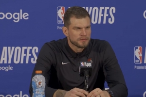 斯普利特:我們在他身上安排了不同的防守人。我們一開始用卡馬拉去防,格蘭特也防了一會兒,然后我們改打小個陣容,我們的大個子也防過他。當然,他打出了一場不可思議的比賽,35分,三分球6投5中。你知道,很難把他趕出內(nèi)線。我認為我們在大部分時間里把他趕出內(nèi)線方面做得很好。當然,他有幾次面對小個子防守順下,那就是白給的得分。但這五記三分球真的傷了我們。