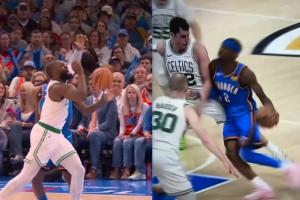 比賽中,SGA在一次合球掛手臂造成犯規后,杰倫·布朗當即對裁判表示:“這不是籃球。”