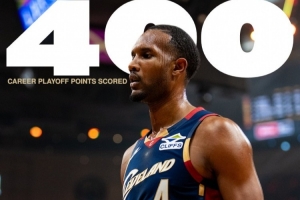 比賽來到第二節,騎士球員小莫布里已砍下10分。至此,小莫布里的生涯季后賽總得分突破400分,來到405。