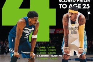 愛德華茲25歲前的總得分超越卡梅隆·安東尼,上升至NBA歷史第四,僅次于詹姆斯、杜蘭特和東契奇。