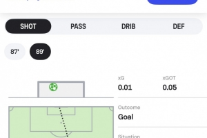 數(shù)據(jù)網(wǎng)站Sofascore曬出居萊爾射門路線圖,并調(diào)侃道:“我們可能需要重新設(shè)計(jì)球員的射門路線圖了,因?yàn)榘雸鰣D已經(jīng)放不下這腳吊射了。”
