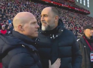 轉播鏡頭顯示,比賽開始前,圖多爾出現在安菲爾德場邊,他走向一個穿著深色外套,雙臂交叉的人面前,拍了拍他的肩膀,打招呼并與他握手——可能認為對方是斯洛特。