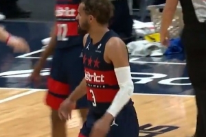 GIF-特雷·楊擠掩護(hù)時撞倒理查德,腿部有些受傷,一瘸一拐回更衣室