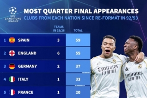 體育資訊3月17日訊 德國轉會市場統計了1992-1993賽季歐冠改制以來各國球隊晉級8強的次數,并列出榜單,西班牙59次最多,英格蘭55次第二。