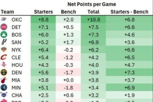 其中掘金隊首發和替補的效率差+7.3,聯盟最高。快船+7.0、森林狼+6.9、雷霆+6.8、湖人+6.7分列前五。騎士+6.5第8,火箭+4.7第9,勇士+3.2第15。