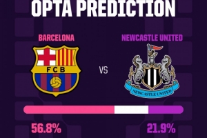 1、Opta超級計算機在10000次模擬后,本場比賽巴薩有56.8%的概率戰(zhàn)勝紐卡。