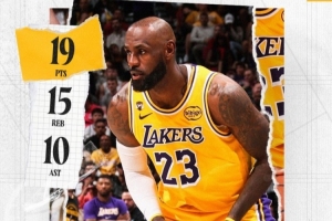 賽后湖人官方發布詹姆斯本場數據海報,本場比賽詹姆斯背靠背出戰并砍下三雙。